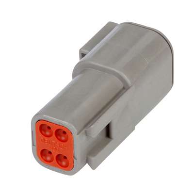 Amperage: 7.5A; Cavities: 4; Color Family: Gray; Connector Type: Deutsch Connector; Contact Size: 20; Contact Type: Pin; Housing Material: Polyamide; Item: DTM 4-Way Receptacle; Mfr. Part Number: DTM04-4P; Number of Positions: 4; Package Quantity: 6; Series: DTM; Shipping Weight: 0 lb.; Wire Range: 20-16 AWG