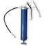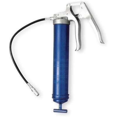 Grease gun features a pistol grip, die-cast zinc pump head, and flex hose.