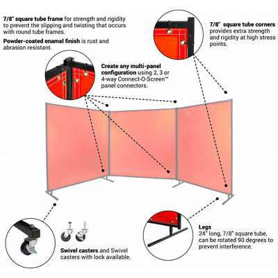 This free-standing Protect-O-Screen® protects workers, material, and equipment from the hazards of welding sparks, spatter, and UV flash. Constructed with 3/4" crossbars and 7/8" corners and legs, the sturdy 18-gauge black steel, rust-resistant, enamel-finish, square tube frame is designed to eliminate the slipping and twisting that occur with round tube frames. Easy-Slide™ slip-fit connection permits quick and easy assembly without tools. The unique modular design allows addition, removal, replacement, and rearrangement of individual panels to quickly adapt to new requirements. Optional casters are available separately.