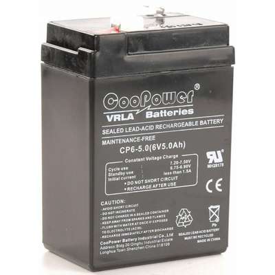 6VDC Sealed Lead Acid Battery, 5.0Ah, Faston, 4.19" Height, 1.76 lb. Weight, 2.76" Depth