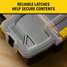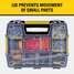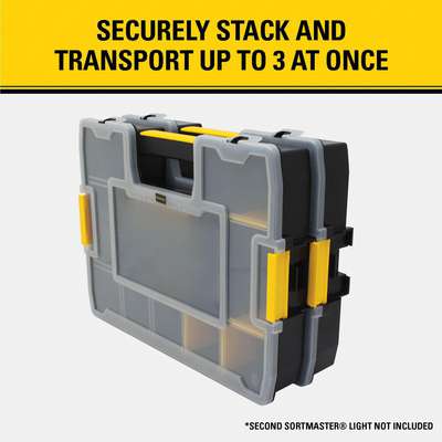 Allows combination of tools and small parts storage. Features locking latches that allow as many as 3 boxes to be stacked and locked together for transport. Movable dividers provide multiple configurations to accommodate a variety of small parts. Impact-resistant plastic construction.