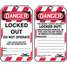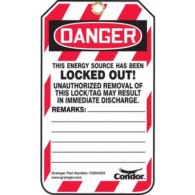 Lockout tag features durable polyethylene construction and reads, "Danger/Locked Out/Do Not Operate/This Lock/Tag May Only Be Removed By:" Open space is provided to write the name of the employee working on the lockout situation, and to include the lockout date. The reverse side reads, "Danger This Energy Source Has Been Locked Out Unauthorized Removal of This Lock/Tag May Result In Immediate Discharge Remarks." Package quantity: 25.