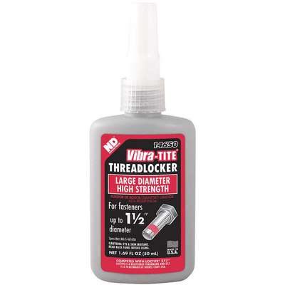 Threadlocker, Threadlocker, Threadlocker Strength High, Threadlocker Color Red, Threadlocker Disassembly Permanent, Physical Form Liquid, Threadlocker Container Bottle, 50 mL, Chemical Type Anaerobic, For Fastener Dia. Up to 1-1/2 in, Begins to Harden 9 min, Series 146, Gap Fill 0.01 in, Full Cure 24 hr, Temp. Range -60 Degrees to 300 Degrees F, Flash Point 268 Degrees F, Specific Gravity 1.1, Viscosity 7000 cP, Removable With Heat and Hand Tools