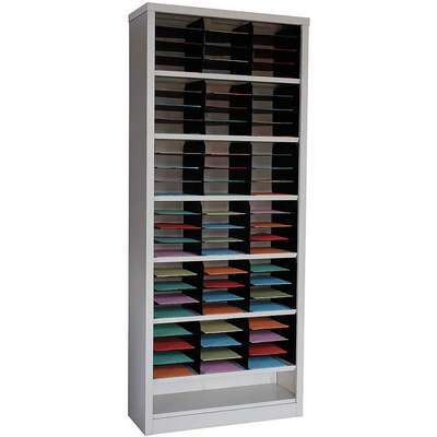 Vertical Literature Organizer, Letter, Construction Steel Shell/Polypropylene Compartment, Height 84 in, Width 34 1/2 in, Depth 13 in, Color Tan, Number of Compartments 72, Load Capacity 150 lb, Includes Labels