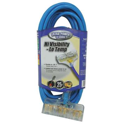 Extension Cord, Location Outdoor, Cord Length 25 ft, Wire Size 14 AWG, Max. Amps 15.0 A, Voltage 125V AC, Plug Configuration NEMA 5-15P, Receptacle Configuration NEMA 5-15R, Cord Ending T-Shape, Number of Outlets 3, Jacket Color Blue, Jacket Material PVC, Trade Designation SJTW, Cord Shape Round, Temp. Rating -58 Degrees to 140 Degrees F, Number of Conductors 3, Power Indicator Yes, Plug Style Straight, Max. Watts 1,875 W, Nominal Outside Dia. 0.37 in