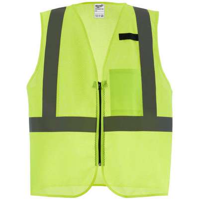 Milwaukee Mesh Safety Vest: X, 4XL/5XL, Yellow, Mesh Polyester, Zipper, Single, Chest Pocket/Mic Tab